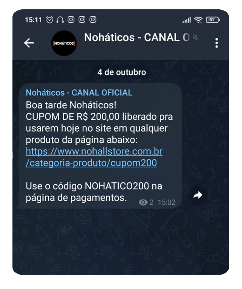 Acesso exclusivo ao Canal privado do Telegram, onde serão postadas ofertas diárias e exclusivas para os Noháticos!